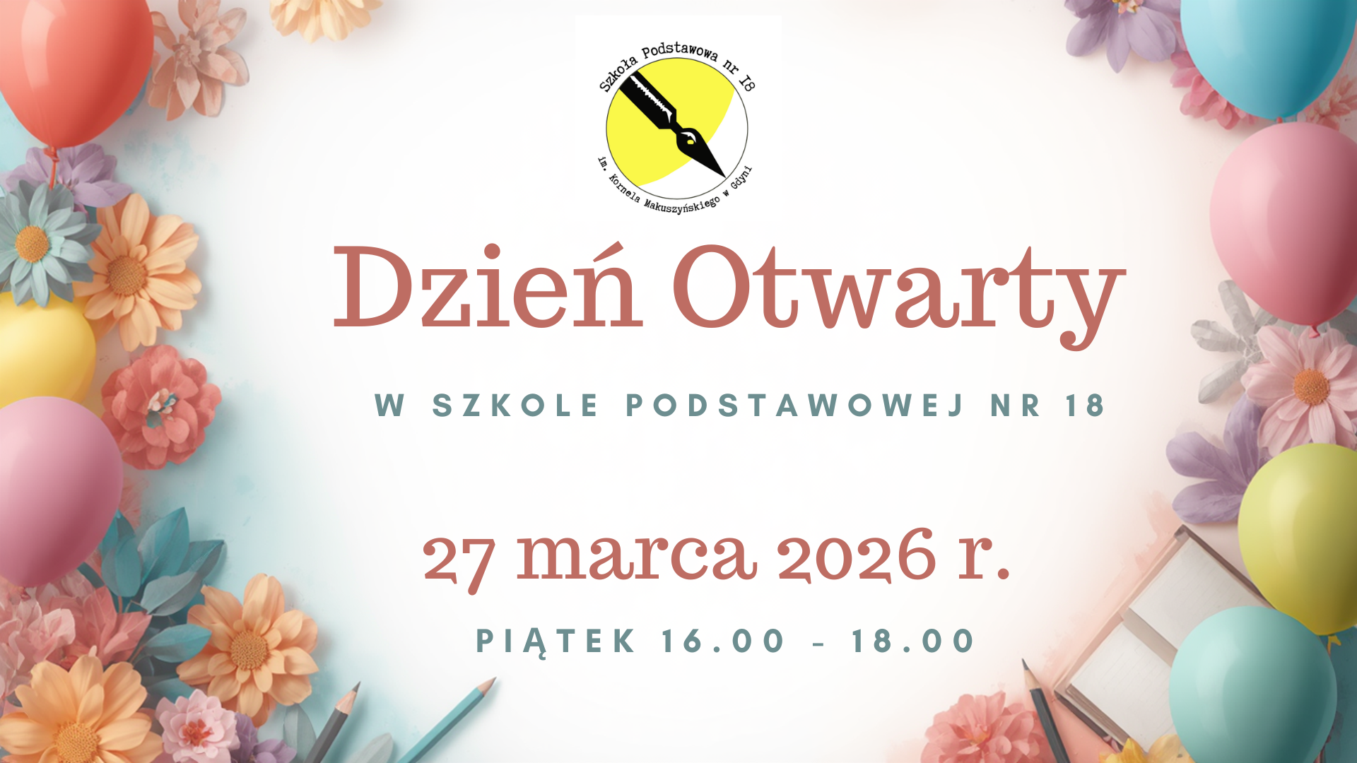 27 MARCA 2026 R. (PIĄTEK) W GODZINACH 16.00 - 18.00 ZAPRASZAMY PRZYSZŁYCH PIERWSZOKLASISTÓW I ICH RODZICÓW NA DZIEŃ OTWARTY